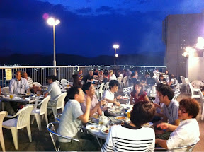 On a bien bu la bière, saké et whisky, BBQ…tout que on peux manger pendant 120 mints pour 3000 yen (25 euros ) . Au Japon on mange très rarement au plein air, comme ici le resto sur le toit d’un grand Hotel. Il ouvre seulement pendant été pour consacrer la bière!!!! Juste
